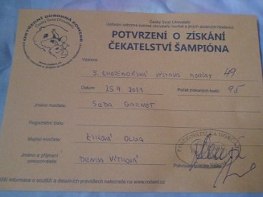 V neděli 25. 9. 2011jsme se zúčastnili 5. Chotěbořské výstavy a jsem velice spokojená. Seda získala svojí první kartičku čekatele na šampiona! Více se dozvíte v sekci Výstavy- 5. Chotěbořská výstava